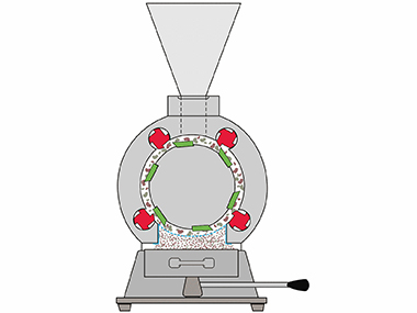 原理:物料經(jīng)喂料斗進入粉碎室。喂料斗下方的插板可精確控制加料量。粉碎室內(nèi)壁上固定著四個特制的切刀,安裝在電動機軸端的轉(zhuǎn)子上裝有六個可換可調(diào)的切刀,刀口方向與內(nèi)壁上的相反以便磨碎物料。調(diào)換粉碎室下部的篩網(wǎng)可以控制物料的粗細度。達到細度的物料落入收集盤中,篩上物繼續(xù)被粉碎直至達到所需細度。