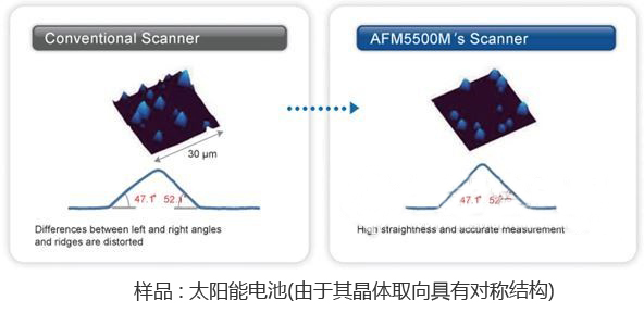 AFM5500M中搭載的全新掃描器,在豎直方向上不會發生彎曲(crosstalk) ,可以得到水平方向沒有扭曲影響的正確圖像。