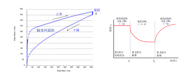 觸變性是膠黏劑的一個很重要的特性,一般的理解是與時間相關的行為,可以考察膠黏劑在使用過程中的流平與垂掛性能。左圖觸變環實驗表明樣品觸變性的大小,右圖三段式模擬樣品靜止 - 破壞 - 靜止整個過程的粘度變化,反應其流平和垂掛性能。