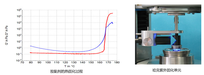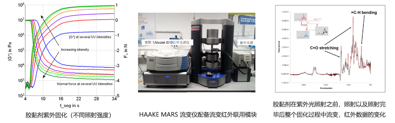 流變儀可以通過測試樣品粘彈性模量的變化全程監測膠黏劑樣品的固化過程,包括熱固化和紫外固化,再配個哈克流變儀專利的流變 - 紅外聯用模塊,更可深入研究固化過程中樣品分子層面的變化,監控反應動力學,反應度。