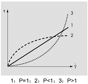 實際上大多數液體不符合牛頓定律,如高分子溶液、膠體溶液、乳劑、混懸劑、軟膏以及固-液的不均勻體系的流動均不遵循牛頓定律,因此稱之為非牛頓流體(non-Newtonian fluid),此種物質的流動現象稱為非牛頓流動(non-Newtonian flow)。對于非牛頓流體可以用旋轉粘度計測定其粘度,對其剪切應力 τ 隨剪切速率的變化作圖可得,如圖 3 和圖 4 中所示的流動曲線(flow curve)或粘度曲線(viscosity curve)。根據非牛頓流體流動曲線的類型把非牛頓流動分為塑性流動、假塑性流動和脹性流動三種。
