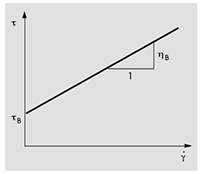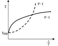 塑性流動(plastic flow)的流動曲線如圖 14-7(b)所示,曲線不經過原點,在剪切應力 τ軸上的某處有交點,將曲線外延至=0,在 τ 軸上某一點可以屈服值(yield value)。當剪切應力達不到屈服值以上時,液體在剪切應力作用下不發生流動,而表現為彈性變形。當剪切應力增加至屈服值時,液體開始流動,剪切速率和剪切應力 τ 呈直線關系。液體的這種變形稱為塑性流動。引起液體流動的最低剪切應力為屈服值 τ0。