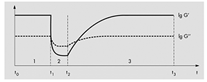 (3)對數變化的剪切應力:控制剪切應力在某一范圍內,按照對數規律逐漸改變剪切速率,可以有低到高,也可以由高到低,觀察樣品的粘度、剪切速率隨剪切應力變化的規律;如:剪切應力由 0.1 Pa 升高到 100 Pa,變化規律為 Profile = Ramp log 或 Ramp log + |points/decade|(對數規律+點數/數量級)。