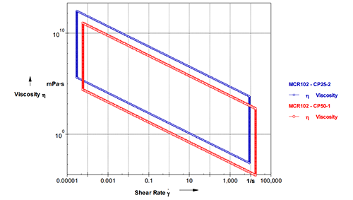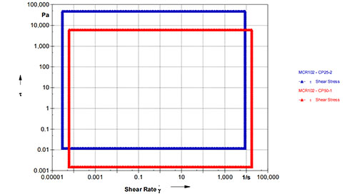 CP25-2 和 CP50-1 轉子的測量范圍,可以得到粘度范圍(Y 軸)、剪切速率范圍(X 軸)。