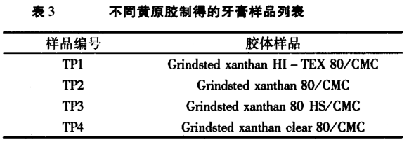 (2)將黃原膠與 CMC 復配使用 ,可得到不同流變性能的膏體,牙膏假塑性和觸變性大小為:TP1—xanthan HITEX80 > TP3 一 xanthan 80HS/TP2 一xnathan 80 >TP4 一xnathan clear80。說明黃原膠 HI一TEX80 與 CMC有更好的協同性,可以制作較好流動性,站立性和分散性的牙膏。
