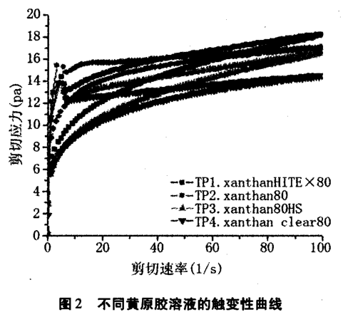 圖 2 中各黃原膠溶液的觸變性較相近, 由于滯后曲線中形成支弧形,表示溶液有凝膠強度,因破壞凝膠結構需要的應力,使溶液恢復正常表觀粘度。