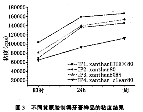 由圖 3 可知 ,不 同黃原膠制得 的牙膏樣 品粘度順序 :TPI—xanthan HITEX80> TP3 一xanthan 80HS> TP2 一xanthan80> TP4 一xanthan clear80 。