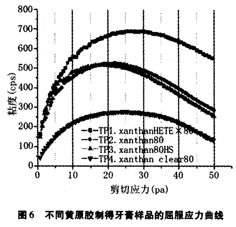 (3)屈服應力可體現牙膏的制造和包裝容易性,4 一xanthan clear80 更容易運輸, 洗刷分散性更好,更容易從牙膏管中擠出。