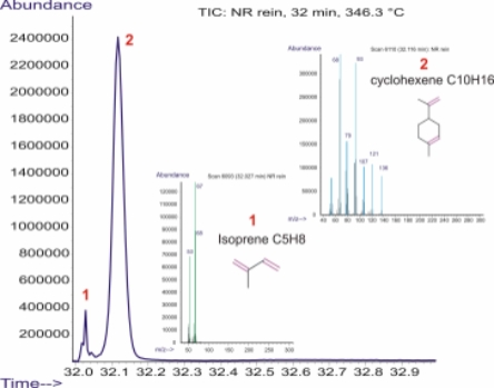 在 NR 分解的起始點(diǎn)(32min,346.3°C),主要的揮發(fā)產(chǎn)物為 isoprene C5H8(TIC 色譜圖的峰1),以及 1-methyl-4-(1-methylethenyl)-cyclohexene C10H16(峰 2)。