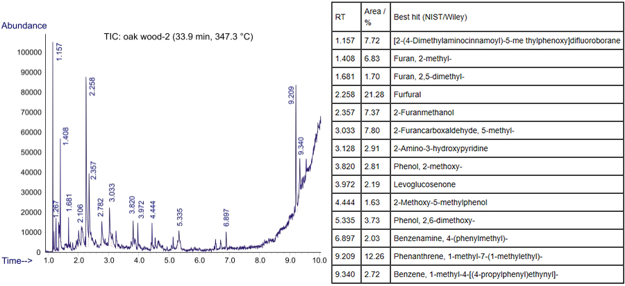 橡樹(shù)木熱裂解過(guò)程第二階段的總離子色譜圖,以及相關(guān)主峰的譜庫(kù)搜索結(jié)果如下(下表以滯留時(shí)間(RT/min)的升序排列):
