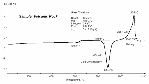 巖石作為一類化學(xué)組成非常復(fù)雜的天然材料的泛稱,一般很難進(jìn)行分析。這類材料通常是多種多樣的氧化物,硫酸鹽或碳酸鹽的混合物。火山巖通常由熔融巖漿凝固而成,其主成分為多種氧化物。本例顯示了對于某種巖石材料的 DSC 測量結(jié)果。玻璃化轉(zhuǎn)變發(fā)生在 623°C 至 655°C 之間,在 884°C 與 1111°C 分別檢測到了冷結(jié)晶與熔融峰(均取峰值溫度)。冷結(jié)晶的放熱熱焓與熔融的吸熱熱焓相近,證明了該混合物接近于完全的無定形材料。