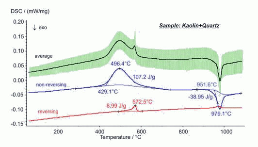 TM-DSC 通常被用于高分子材料的低溫測試,而 DSC 404 F1 Pegasus® 是世界上第一臺將TM-DSC應(yīng)用到高溫測試的儀器。圖中顯示的是高嶺土石英混合物的測試結(jié)果。在DSC不可逆曲線上可以觀察到高嶺土不可逆的脫水過程和相變。,而DSC可逆曲線上則觀察到石英在 573°C 的相變效應(yīng)。