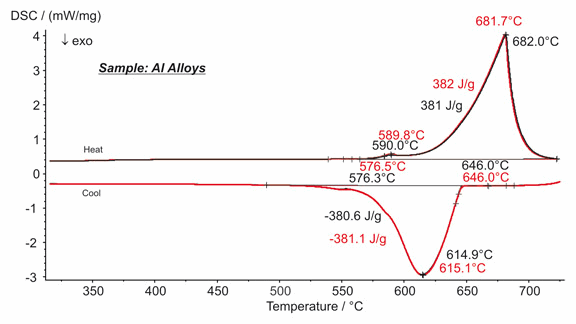 對某一鋁合金材料(Al-Mg-Si)取兩片樣品,使用 DSC 404 F3 Pegasus ® 進(jìn)行了測量,在升溫與降溫曲線中可以清晰地看到合金的熔融與凝固過程。兩片樣品的測試結(jié)果幾乎完全吻合,不管對于升溫與降溫,其特征溫度(起始點(diǎn),峰值)差別均在 0.3K 以內(nèi)。峰面積的差別均小于 1%。兩次測量結(jié)果間的良好的一致性表明了 DSC 404 F3 Pegasus® 的測量重現(xiàn)性。