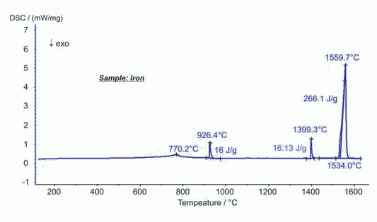 這個數(shù)據(jù)是在配備銠爐體的DSC 404 F3 Pegasus® 上測試得到的,實(shí)驗(yàn)溫度從室溫至1620°C。在770°C處出現(xiàn)的峰是材料的磁性能發(fā)生變化(居里轉(zhuǎn)變)引起的。926°C和1399°C處的峰是材料的晶型轉(zhuǎn)變引起的。可能是因?yàn)樵摌悠分羞€有雜質(zhì),得到的數(shù)據(jù)與文獻(xiàn)值略有差別。熔融出現(xiàn)在1534°C,熔融熱為266.1J/g,與純鐵的文獻(xiàn)值偏差為1.5%