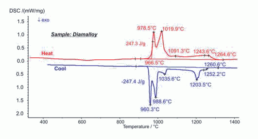 青銅合金是一種銅基合金,在古代人們就開始用它作為武器、容器或其他的金屬制品。今天它還經(jīng)常被做成軸承和彈簧元件。根據(jù)合金中錫的含量和添加劑的比例不同,合金的熔融行為會發(fā)生改變。圖中的合金樣品是用在滲透工藝中的。在521°C和568°C(起始點(diǎn))范圍內(nèi)樣品發(fā)生固相相變。熔融出現(xiàn)在777°C,整個熔程跨度超過200K,994°C后樣品完全熔化。