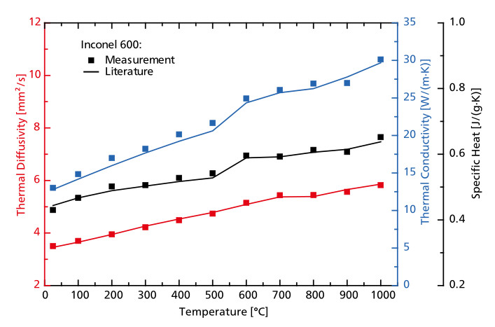 圖中曲線為標樣 Inconel 600 的熱擴散系數(紅點)、導熱系數(藍點)和比熱(黑點)測試結果。與理論值(實線)相比,實測數據點的偏差均小于±3%,精度水平普遍好于±3%。
