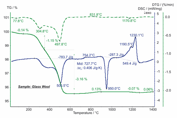 玻璃棉常用作房屋與加熱管道的隔熱材料。STA 測試在約 600°C 以下顯示了三個失重臺階,這些是由于吸附水的揮發與有機粘合劑的燒失所致。其中有機粘合劑的燒失對應于該溫度范圍內的強烈的 DSC 放熱峰。玻璃化轉變在 DSC 曲線上表現為 728°C 附近的臺階,比熱增加 0.41J/(g*K)。950°C 的 DSC 放熱峰對應于結晶效應,熱焓 -287 J/g;1050°C 至 1250°C 之間的吸熱效應對應于熔融,總熱焓 549 J/g。700°C 以上的微量的質量變化最可能是由于雜質的氧化與揮發所致。