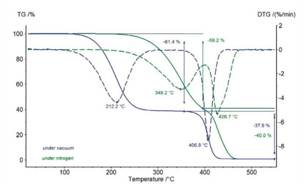 TG 209 F1 Libra™ 可配備獨(dú)一無二的全自動(dòng)真空系統(tǒng)。如圖中藍(lán)色曲線所示,由于真空下的測(cè)試降低了增塑劑的蒸汽壓,兩個(gè)失重過程分離的更為明顯。