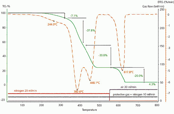 TGA 是測(cè)定橡膠組分和增塑劑含量的標(biāo)準(zhǔn)方法。如圖所示為某一橡膠復(fù)合材料的熱分解過程,在增塑劑(含量大約7%)揮發(fā)之后,樣品中的第一個(gè)彈性體組分在 383°C附近分解(失重量 38%),第二個(gè)彈性體組分在 448°C分解(失重量31%)。計(jì)算得到炭黑含量是 20%,灰分為 4%。DTG 峰值溫度表明該材料為添加碳黑的 NR/SBR 橡膠混合物。