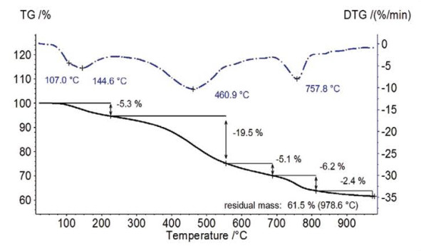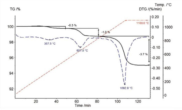 TGA 測(cè)試分析顯示出在較低溫度下云母脫水和脫羥基的失重過程。TG 209 F1 Libra™ 配備新型的陶瓷爐體,具有寬廣的溫度測(cè)試范圍,最高溫度達(dá) 1100℃,能夠觀察到云母在 1093°C 的特征失重溫度。