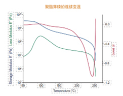 右圖是使用拉伸夾具對50微米厚的PET薄膜在50-250℃間進行的變溫振蕩測試。可以明顯觀測到兩個主要轉變:玻璃化轉變在大約109℃;熔融溫度在234℃。在玻璃化轉變,長度的明顯表明樣品有顯著的收縮。