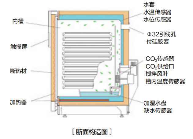 過電流漏電保護開關、獨立過升防止器、溫度上下限異常、CO2濃度上下限異常、自診斷功能、水槽水位異常(電極式)、門打開報警、加濕水缺水報警(熱敏電阻)、按鍵鎖 |