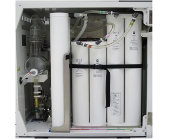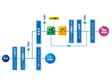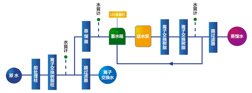 前處理樹脂→離子交換→蒸餾→水箱→離子交換→過濾 自動循環 ( 手動循環 ) |