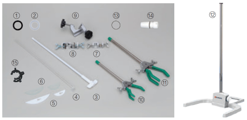 使用說明書、保證書、軸、M5角螺栓、六角扳手、AC適配器、電源線、 保護罩 燒瓶夾 |